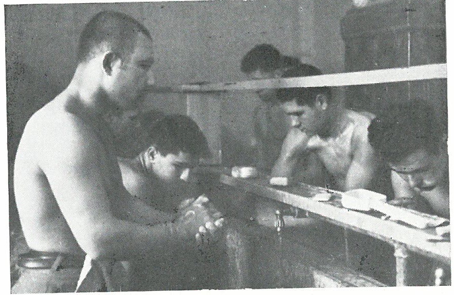 Плешивият в средата на тази снимка е колегата Васил Богданов, когото всички наричахме Боко. Много остроумен (бе втори по успех във випуска) и голям зевзек. Тук пак разказва някакви лакърдии. На квартирата си в Разград, където служеше, бе написал „В. Б – Гинеколог-любител“. Седящият от лявата му страна е Аспарух Крежов (Пухчо), който бе национален състезател по шахмат. За съжаление и двамата починаха.