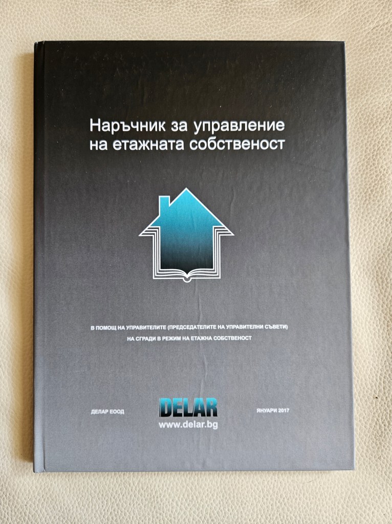 За своя разработка и публикация смятам също „Наръчник за управление на етажната собственост“, издаден през 2017 г. от „Делар“ ЕООД в помощ на управителите (председателите на управителните съвети) в жилищните сгради, строени от дружеството, на което съм мениджър по качеството. Наръчникът (на долната снимка) бе изцяло съобразен със Закона за управление на етажната собственост, приет през 2009 г. Раздаваме го на избраните лица на първите общи събрания на собствениците в новопостроените сгради. Много полезен наръчник, даващ отговор на най-често срещаните проблеми при съжителството, например как да се постъпи, ако някой собственик или наемател не си плаща задълженията или не спазва правилника за вътрешния ред. За съжаление, цитираният закон се нуждае от осъвременяване, но вече години наред нито едно правителство и нито един парламент не се нагърбва с тази отговорност.